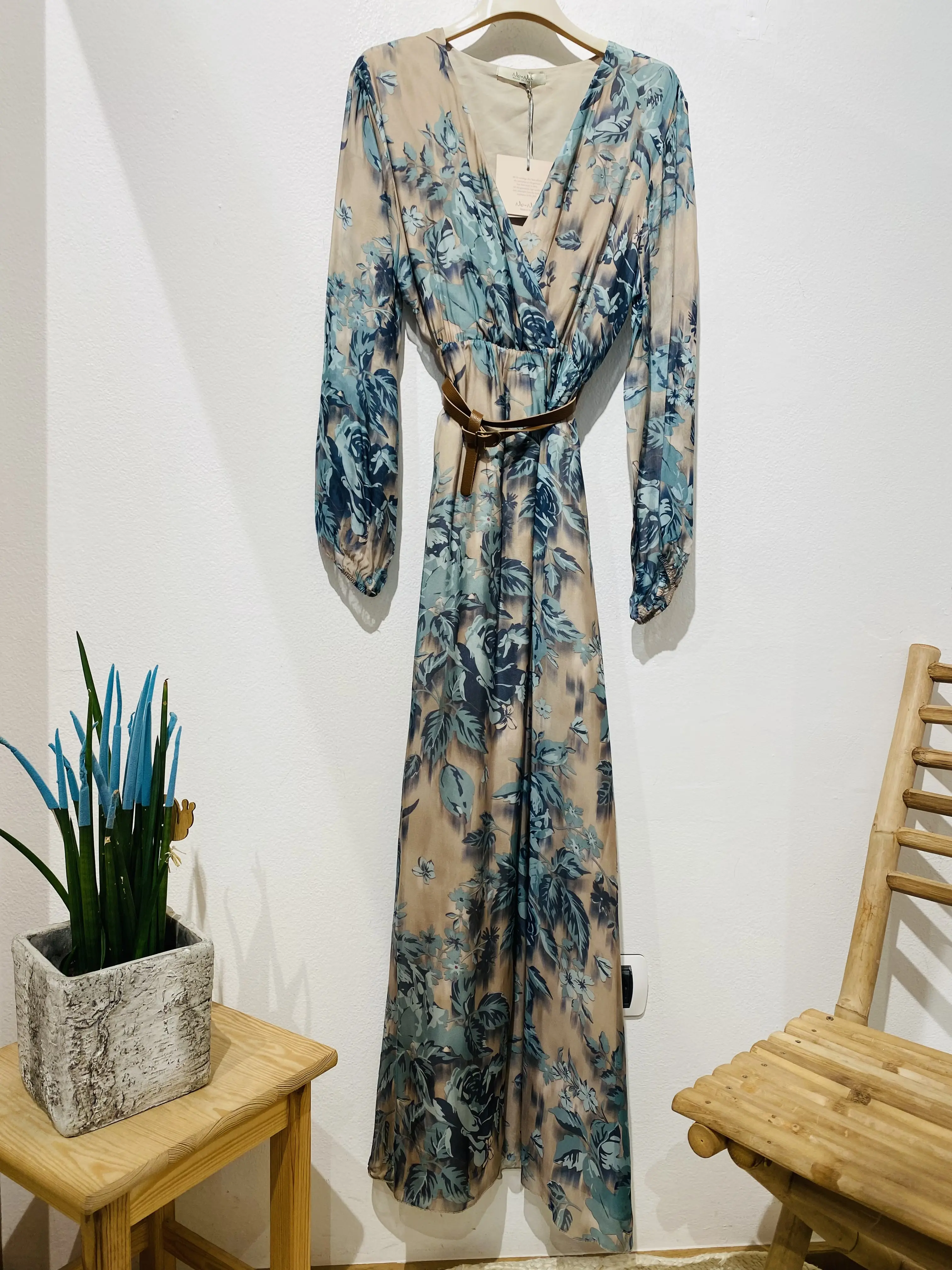 Abito lungo stile impero con fantasia bouquet nei toni del turchese, made in Italy, 70% cotone, 30% seta, fodera: 100% cotone