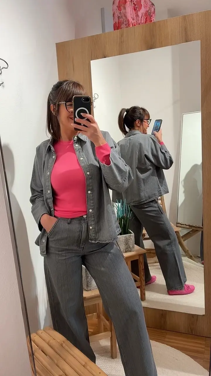 Camicia in denim grigio , jeans fermo , fit a scatoletta , bottoni a pressione in madreperla .