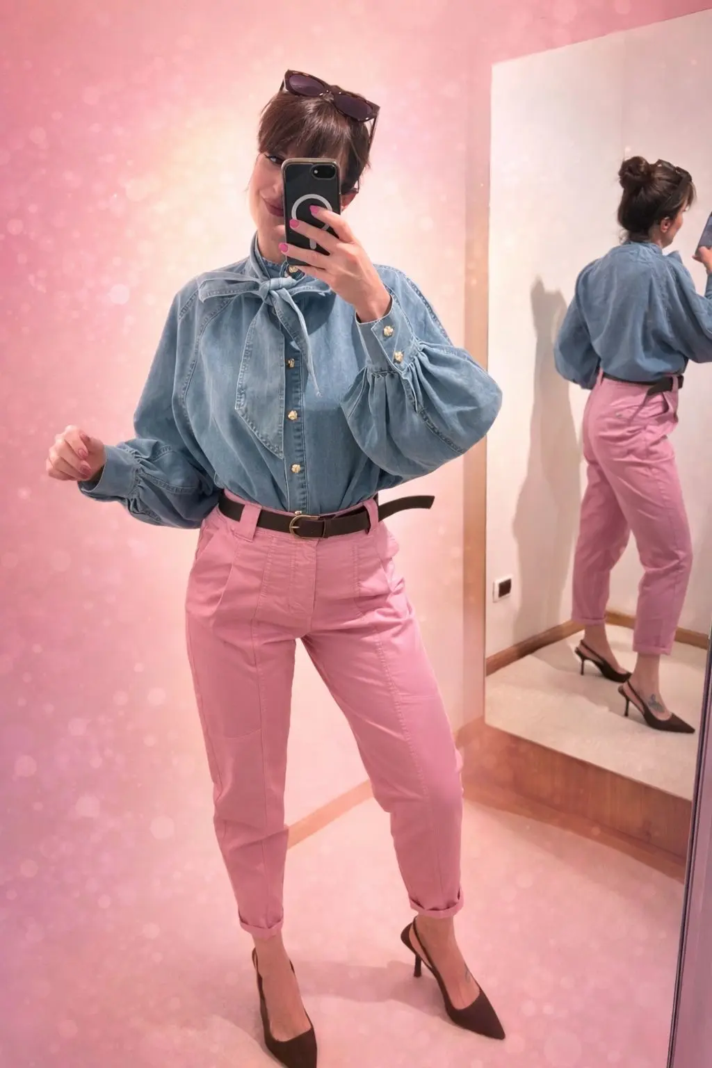 Stupenda camicia in denim leggero , bottoni dorati , manica a sbuffo , fiocco al collo , tg unica