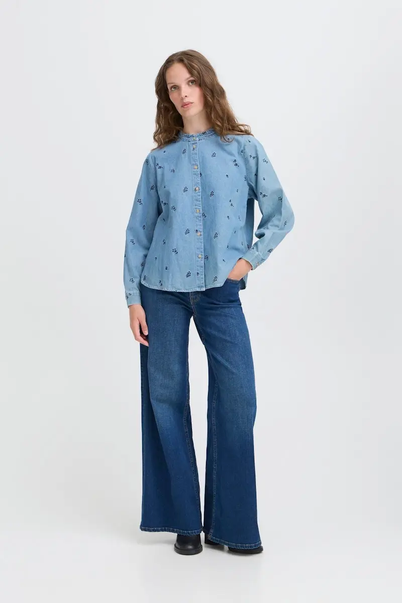 Camicia in jeans fermo con ricami a contrasto in blu 100% cotone