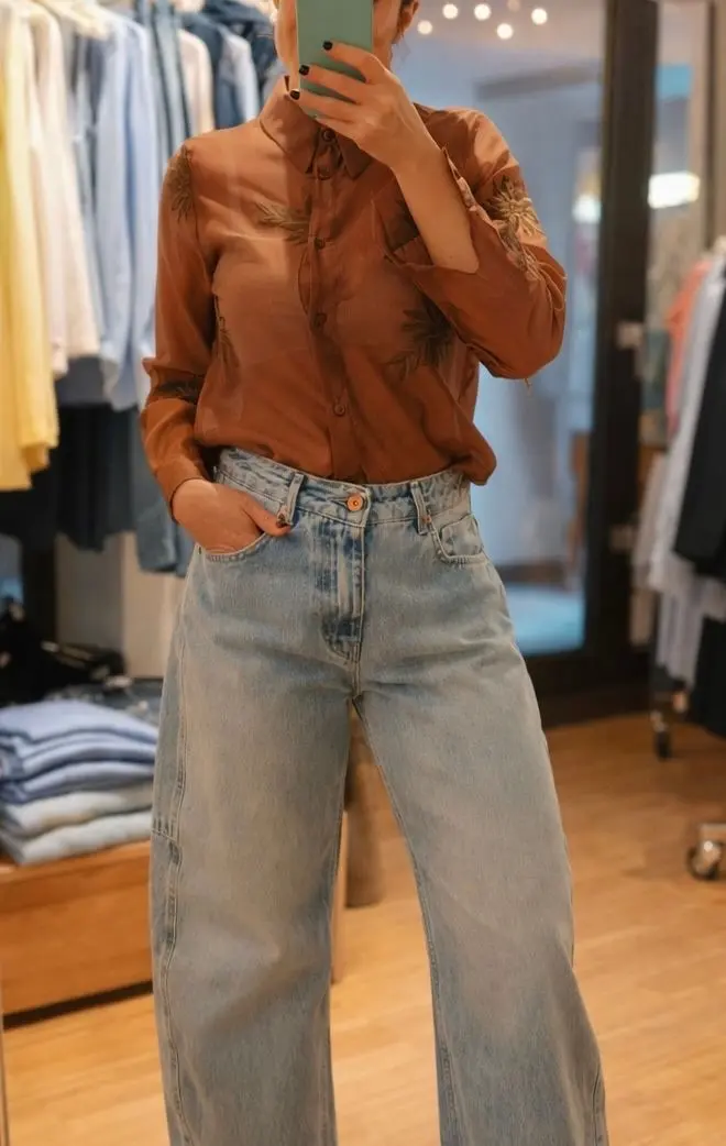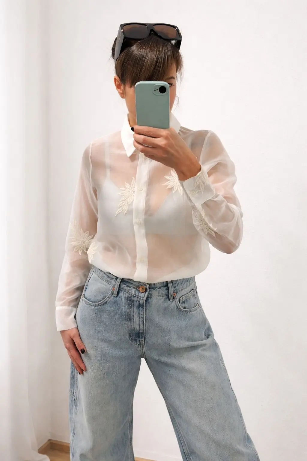 Bellissima camicia con fiori ricamati , tessuto tencel