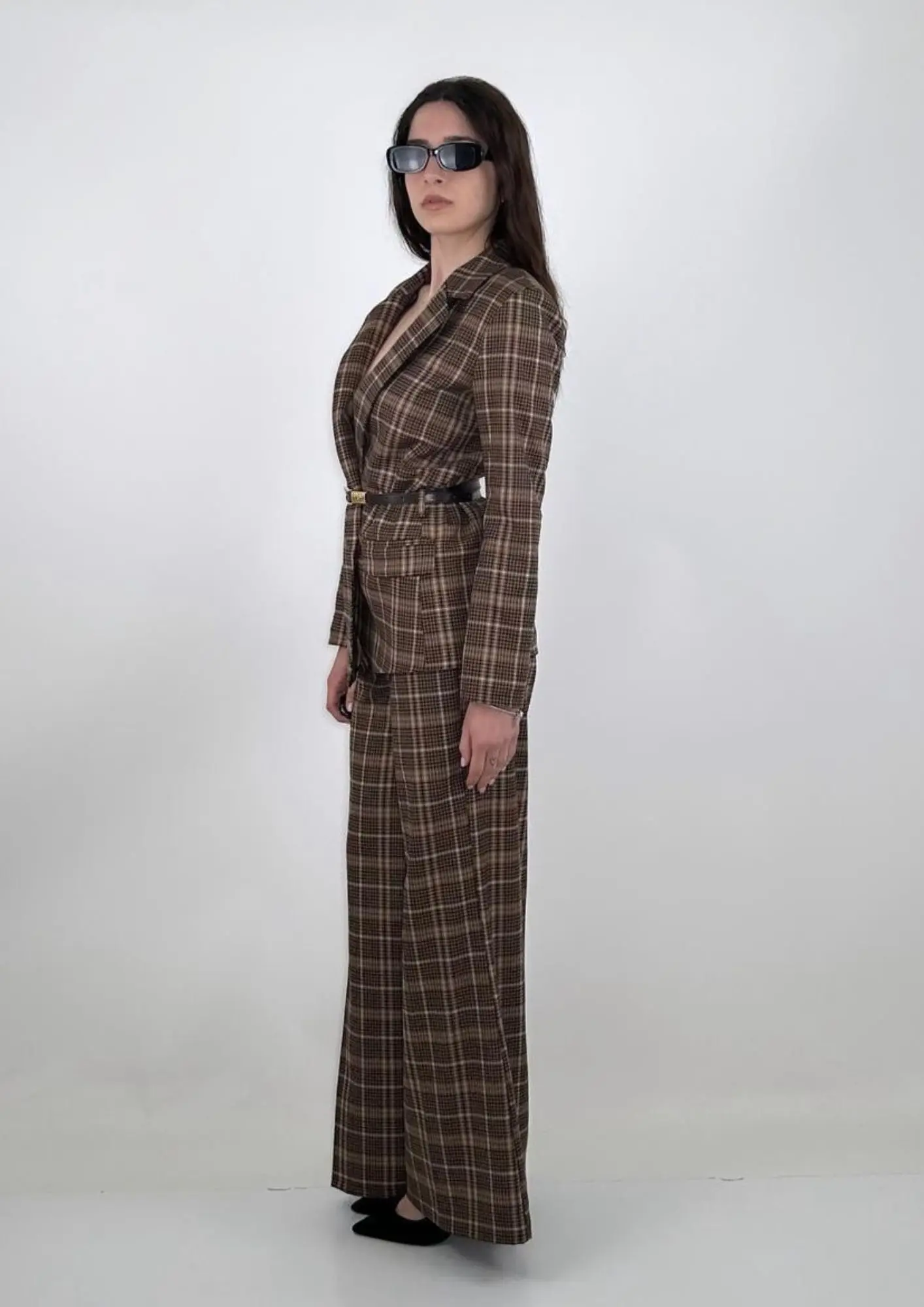 Pantalone modello palazzo in fantasia tartan nei colori must have di stagione per un look formale o informale. La vita alta elasticizzata dona confort e le tasche a scomparsa regalano praticità. Consigliato in abbinamento alla giacca.